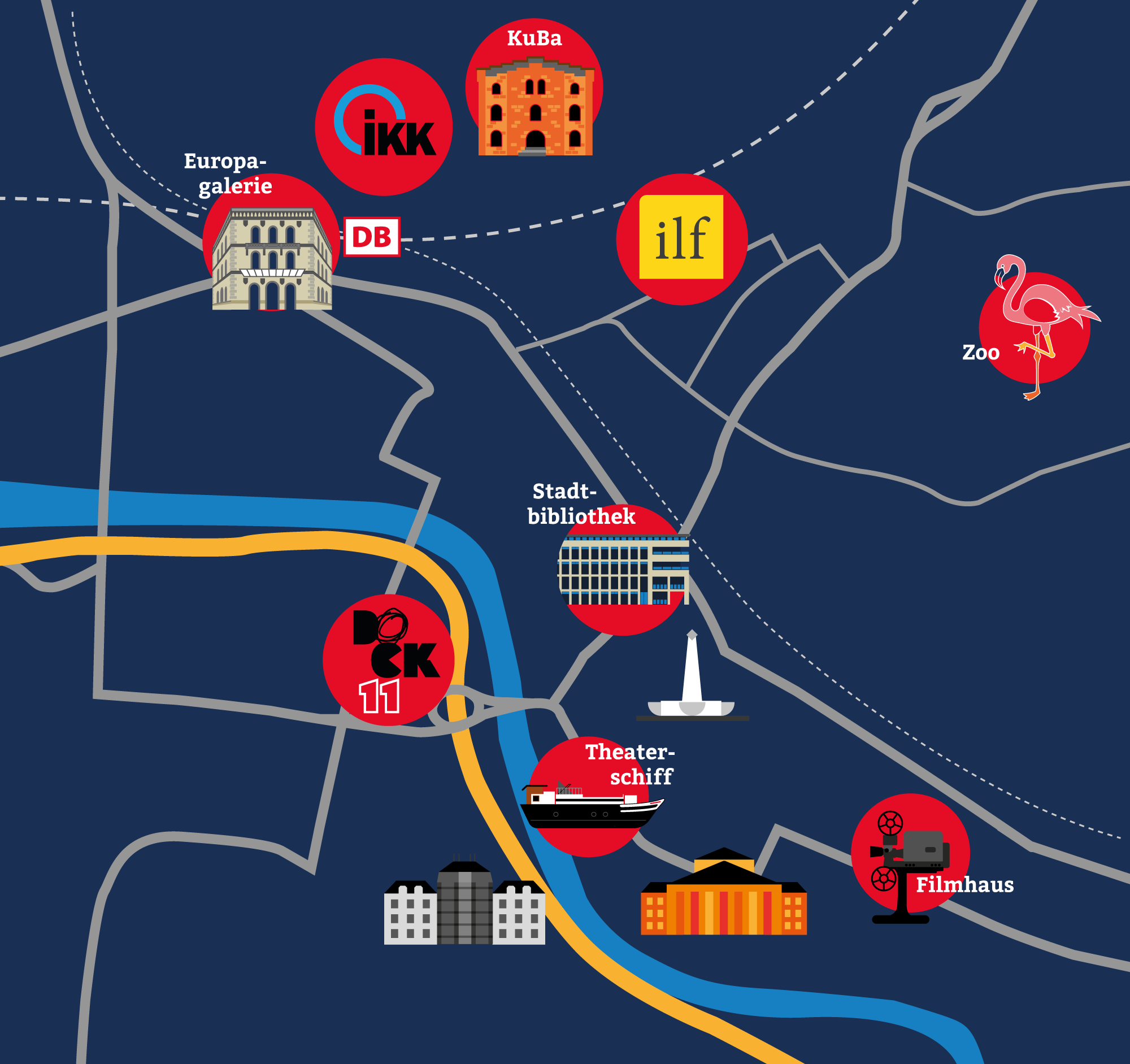 Auf unserem Messegelände im Quartier Eurobahnhof erwarten Sie – wie gewohnt – zahlreiche Lesungen, Workshops und Vorstellungen „rund ums Buch« in unserem Messezentrum, dem KuBa – Kulturzentrum am Eurobahnhof. Dort wird auch die große internationale Bücherschau mit ihren einladenden Bücherinseln zu finden sein. Hier erhalten Sie sämtliche Informationen und können in unserer Messebuchhandlung viele der ausgestellten Bücher auch direkt erwerben. Vom KuBa aus geleiten wir Sie zu Ihren Veranstaltungen im Quartier Eurobahnhof.